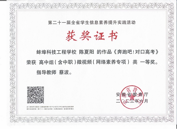 在第二十一届全省学生信息素养提升实践活动中,电子信息工程系教师蔡波指导学生陈夏阳作品《奔跑吧!对口高考》荣获高中组(含中职)微视频(网络素养专项类)一等奖,并代表安徽省参加全国展示。
