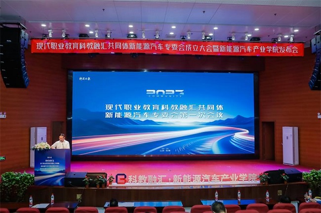 全体与会代表共同见证了现代职业教育科教融汇共同体新能源汽车专委会成立仪式、新能源汽车产业学院发布仪式和新能源汽车科教融合首批合作项目签约仪式。