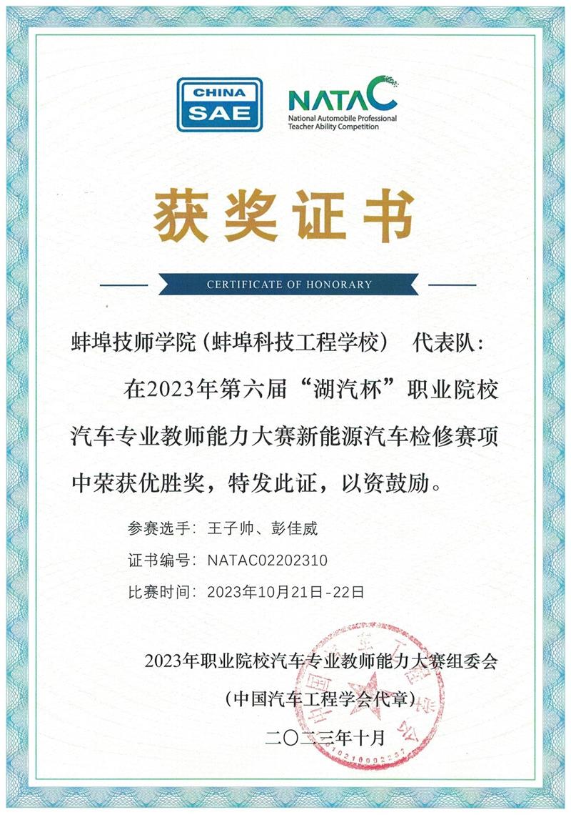 10月21日-22日,2023年由中国汽车工程学会主办的第六届“湖汽杯”职业院校汽车专业教师能力大赛新能源汽车检修赛项决赛在湖南汽车工程职业学院如期举行。由王子帅、彭佳威两位青年教师组成的蚌埠技师学院参赛团队,与来自全国各省市的高职院校和技师学院共27支参赛队伍同台竞技,经过激烈角逐,最终获得全国第八名优胜奖。充分展示了蚌埠技师学院新能源汽车专业青年教师精益求精的教学业务水平和专业能力。