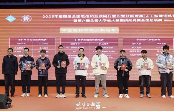 12月8日-9日,2023年第四届全国电信和互联网行业职业技能竞赛(人工智能训练师)暨第六届全国大学生大数据技能竞赛全国总决赛在郑州圆满落幕,蚌埠技师学院师生荣获两项大奖。