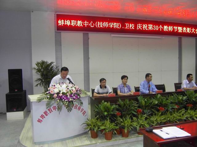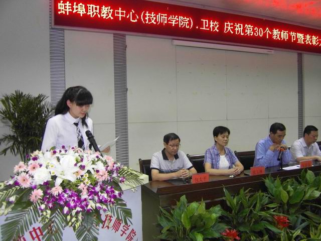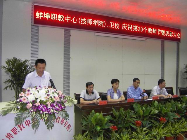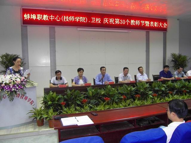 校党委书记胡业武宣读了《蚌埠职教中心(蚌埠技师学院)关于2014年教师节表彰的决定》,之后,举行了热烈喜庆的颁奖仪式,部分获奖人员作为代表上台接受了校领导的颁奖和祝贺。
