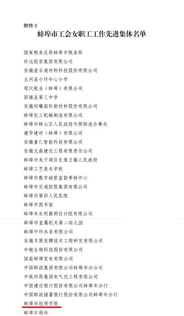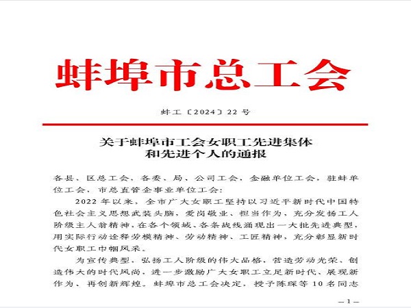 “奋进新征程、巾帼绽芳华”。蚌埠市总工会[2024]22号文《关于蚌埠市工会女职工先进集体和先进个人的通报》,我院荣获“蚌埠市工会女职工工作先进集体”荣誉称号。