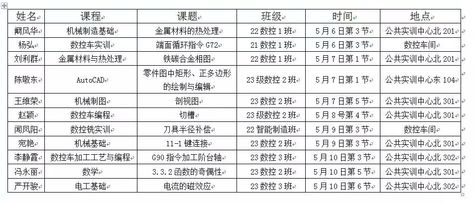 1.5月6日-10日,周实训班:22汽修2班(变速器拆装实训);23汽修1班(汽车美容实训);21机电2、3合班(电机拆装与维修实训);22机电3班(机电一体化、电气安装与维护)。