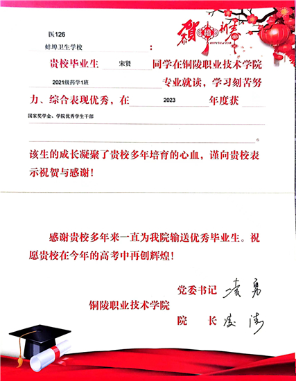 在喜报中,我校毕业生宋贤等五位同学,在铜陵职业技术学院分别获得了2023年国家奖学金、校内二等奖学金、校内三等奖学金、院级三好学生、学院优秀学生干部等奖项。