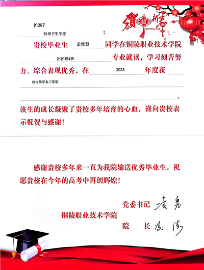 近日,我校收到了多封来自铜陵职业技术学院的喜报,内容是关于我校毕业生在铜陵职业技术学院学习过程中取得的优异成绩和卓越表现。这份喜报不仅是对我校教育质量的肯定,更是对我们教育工作的鼓励和鞭策。