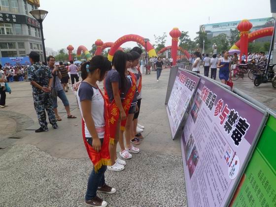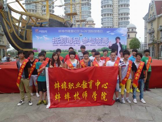 2012年6月26日上午,我校100名禁毒志愿者在淮河文化广场参加全市禁毒教育活动。活动中我校禁毒志愿者参加全市纪念“6.26国际禁毒日”活动启动仪式,向群众发放了毒品预防教育材料,观看了禁毒宣传展板。