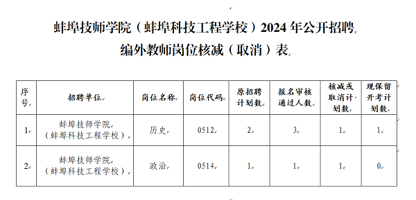 根据《蚌埠技师学院(蚌埠科技工程学校)2024年公开招聘编外教师公告》以及报名确认等情况,经核定,现将报名审核后达不到规定开考比例的岗位计划核减(取消)情况予以公布,详见附表。