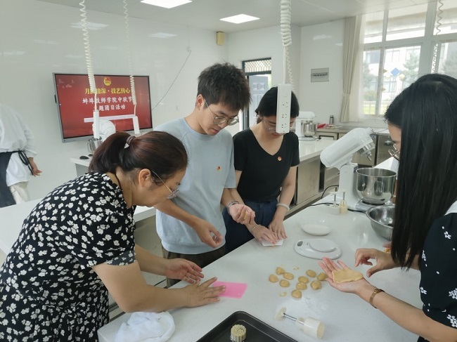 月圆情深,技艺传心。在制作月饼过程中,教工团支部的团员们在公共服务系西点专业教师的指导下相互协作、相互交流,揉面团、包馅、印模、装盒,忙得不亦乐乎。