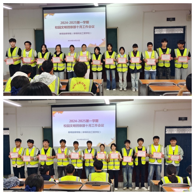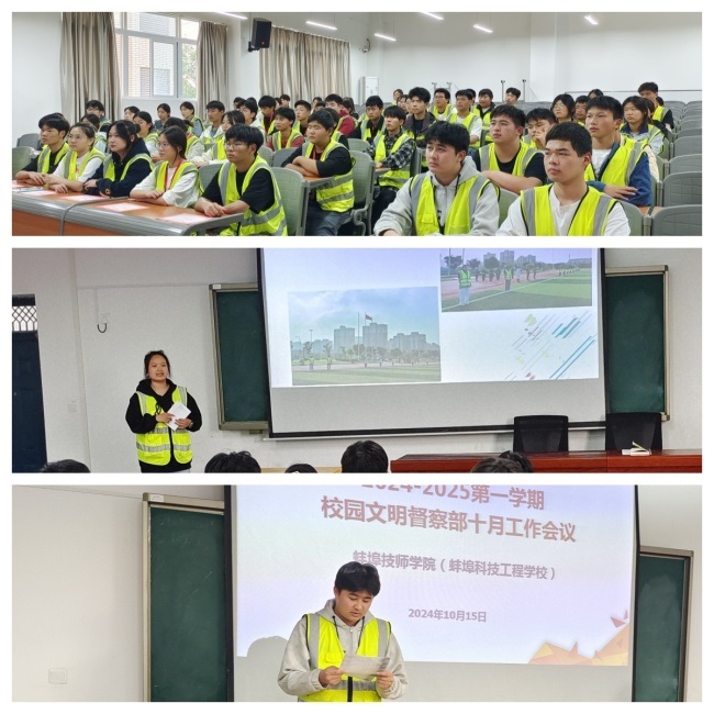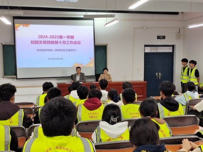 2024年10月15日下午放学后,我院学生处组织召开了10月份文明督察部工作会议。本次会议旨在进一步加强校园文明建设,提高学生的自我管理能力,营造良好的学习生活环境。全体文明督察员参加会议,由学生处房慧萍副处长主持。