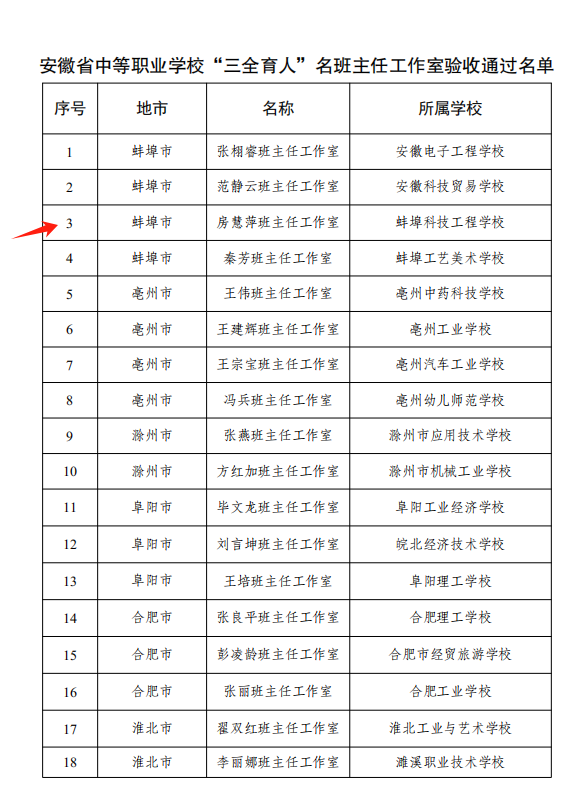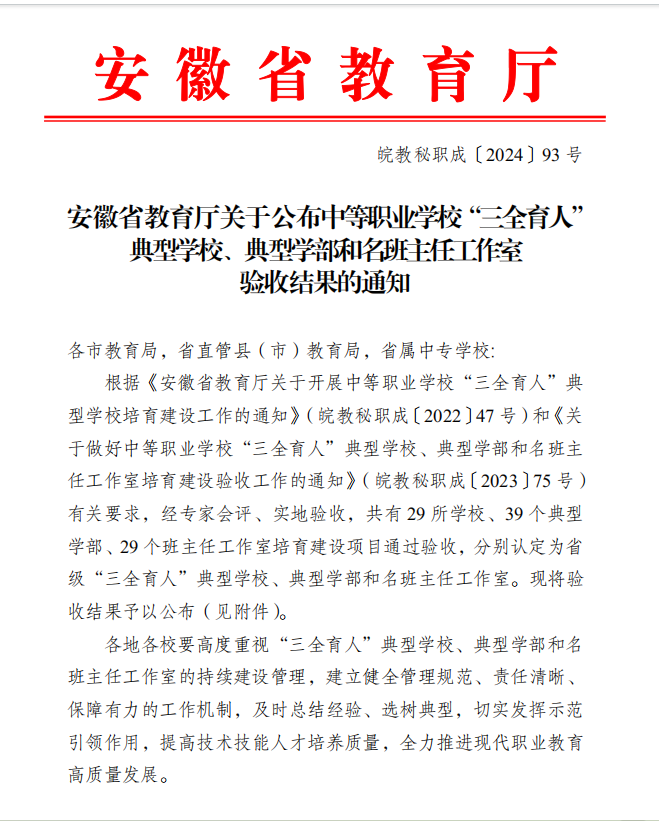 2024年12月24日,根据(皖教秘职成〔2023〕93 号)《安徽省教育厅关于公布中等职业学校“三全育人”典型学校、典型学部和名班主任工作室验收结果的通知》,我院“房慧萍名班主任工作室”经过专家会评、实地验收,成功被认定为省级名班主任工作室。这是对我院名班主任工作室工作成效的肯定,也是对全体班主任团队工作的高度认可。
