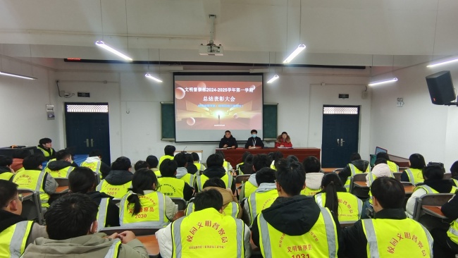 为营造积极向上的育人氛围,加强学生干部队伍建设,2025年1月2日中午,我院文明督察部期末工作总结表彰大会在4号楼207阶梯教室顺利举行。副院长陈垚、学生处处长李恪出席本次大会,学生处房慧萍副处长主持会议。