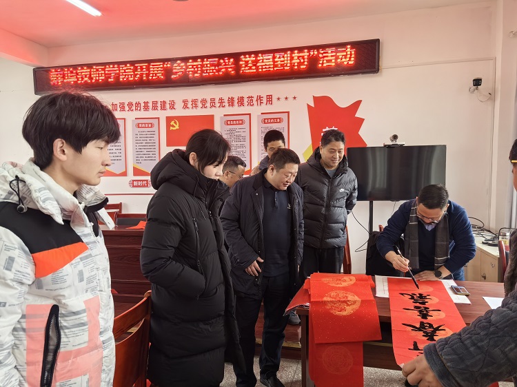 在北严村,学院领导班子亲切慰问了驻村干部,并与包集镇领导、北严村两委干部及驻村工作队进行了座谈交流,详细了解乡村振兴工作进展和实际需求。随后,第五党支部、团委的老师们带领书法老师和书法专长学生组成书法志愿者队伍,在北严村委会二楼大会议室为村民们书写春联,提前送上新年的祝福。