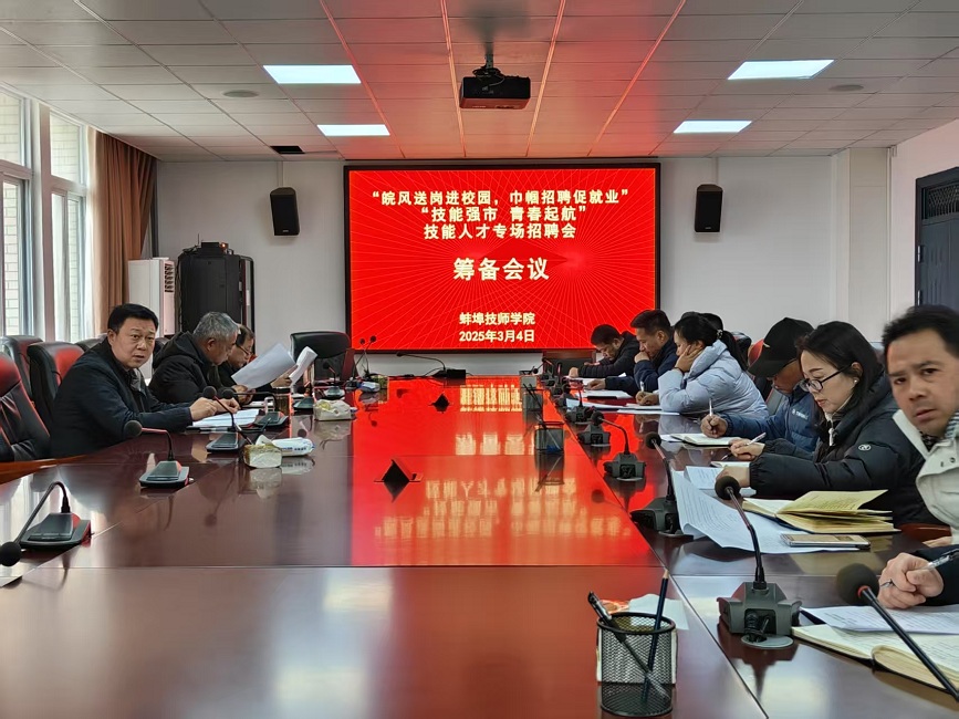 为扎实推动蚌埠市毕业生就业服务工作,助力学生迈向高质量就业之路,3 月 4 日,在行政楼307会议室我院组织召开 “皖风送岗进校园,巾帼招聘促就业”技能人才专场招聘会筹备会议。学院办公室、总务处、学生处、教务处、保卫处、招生就业办公室以及各系部的相关负责人参会,针对即将举办的招聘会展开全面部署。
