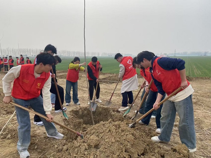 在植树现场,师生们分组协作,有条不紊地开展植树工作,挥锹铲土、扶树正苗、培土踩实,每一个环节都一丝不苟,呈现出一片热火朝天的劳动景象。
