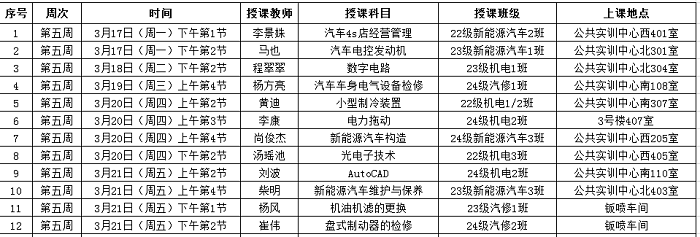 1.3月17日-21日,周实训安排:23汽修1班(二级维护实训,指导教师:杨风、程永奇);24汽修2班(变速器拆装实训,指导教师:牛玉喜、崔伟);24新能源汽车4班(汽车电工电子实训,指导教师:于绍友)。