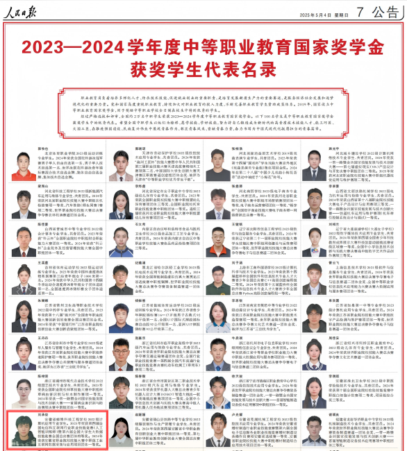 2025年5月4日是五四青年节,节日当天《人民日报》发布“2023-2024学年度中等职业教育国家奖学金获奖学生代表名录”,该名录每年在全国约2万名获奖学生中评选出前100名优秀中职学生代表上榜,其中安徽省共4名学生,刘承俊同学成为蚌埠市唯一一名上榜的学生。