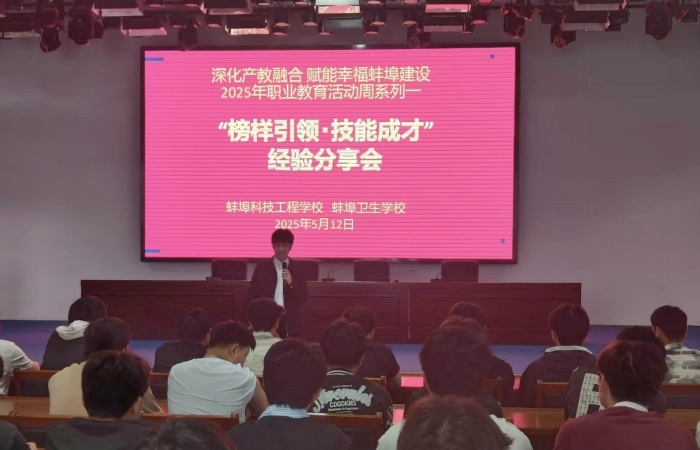 5月12日,蚌埠科技工程学校 蚌埠卫生学校职业教育活动周进入第二日,以“榜样引领・技能成才”为主题,机械工程系“金牌工匠面对面”经验分享会于校报告厅举行,200余名师生齐聚一堂,聆听榜样力量。