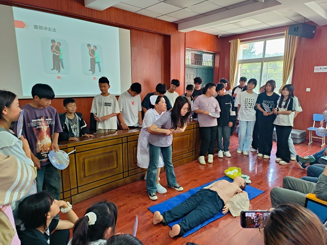 “心脏骤停后的‘黄金4分钟’是挽救生命的关键”“海姆立克急救法能帮助气道异物梗阻者脱离危险”……活动现场,蒲妍老师深入浅出地讲解了心肺复苏(CPR)、海姆立克急救法等关键急救技能。教学团队还特别设计了“户外溺水”情景模拟环节:通过溺水视频设置情景,模拟如何迅速判断、呼救并实施心肺复苏。让学生直观感受急救技术的重要性,谨记严防溺水珍爱生命。