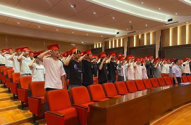 “遵守宪法和法律,履行公民的权利和义务。诚实守信,自律自强。学好本领,报效祖国……”全体学生高举右拳,齐声宣读成人礼誓词,铿锵誓言响彻会场,展现以成人之姿投身技能报国的坚定决心。