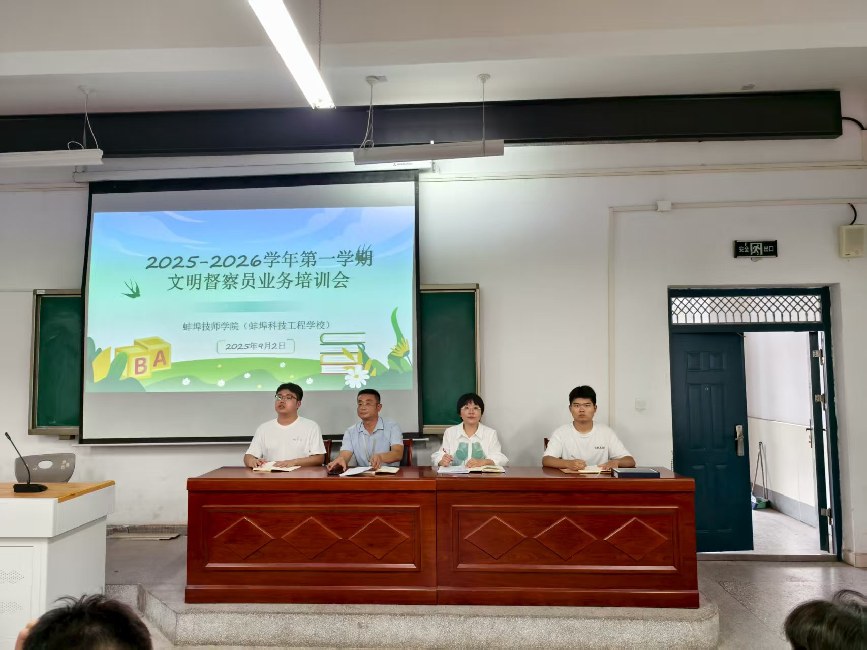 为全面提升校园文明建设水平,进一步加强学生自我管理、自我服务能力,9月2日下午,蚌埠技师学院学生处在阶梯教室207组织召开了2025-2026学年第一学期文明督察员业务培训会。学生处处长李恪、副处长房慧萍、教师张奥、汤瑶池及全体文明督察员共同参会。本次会议由汤瑶池主持。
