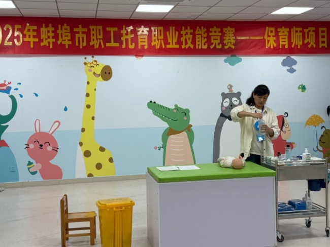 为深入学习贯彻庆祝中华全国总工会成立100周年暨全国劳动模范和先进工作者表彰大会精神,推动新时代托育服务规范化、专业化发展,根据省总工会、省卫健委、省妇联、省计生协相关工作部署,由蚌埠市总工会、蚌埠市卫生健康委员会、蚌埠市妇女联合会、蚌埠市计划生育协会联合主办的2025年蚌埠市职工托育职业技能竞赛暨省赛选拔赛于9月11日在蚌埠技师学院举行,全市各县区共18支代表队参赛。作为本次竞赛的承办单位,学院高度重视、精心筹备,全力保障赛事顺利开展,为全市托育行业职工搭建技能交流与展示平台。