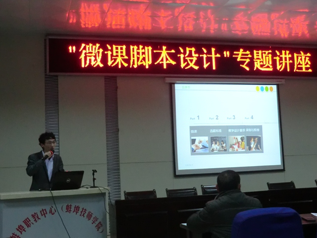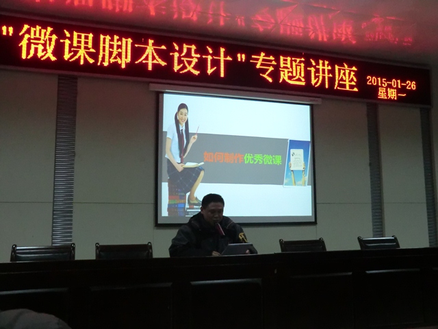 2015年元月26日,我校聘请超星集团安徽地区慕课制作总监韩济联老师,在学校综合报告厅举办了“微课脚本设计”专题讲座,全体教学人员和在家校领导按时到场聆听了讲座。