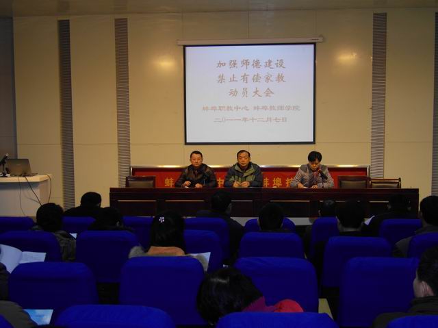 12月7日,蚌埠职教中心·蚌埠技师学院召开全校师德师风建设专题大会。会上,张玉琳副校长宣读了《蚌埠职教中心、蚌埠技师学院加强师德师风教育禁止有偿家教实施方案》和《蚌埠职教中心·蚌埠技师学院禁止有偿家教管理制度》,马太民书记结合学校师德建设实际,对进一步加强师德师风教育讲了三点意见。