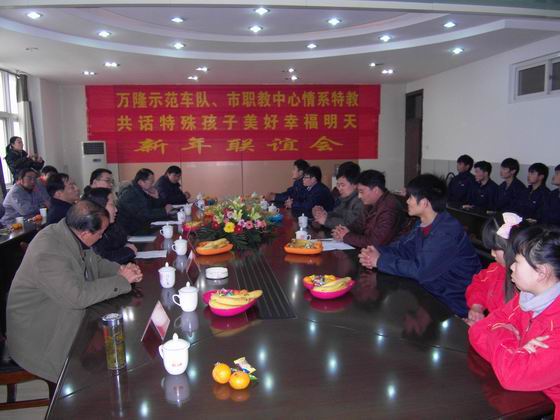 12月27日下午,“万隆示范车队·市职教中心情系特教,共话特殊孩子美好幸福明天新年联谊会”在我校会议室举行。校领导马太民书记、宋晓宾副校长、万隆车队的师傅们,以及特教中心的领导、老师和参培的全体同学与会。市教育局、车管所的领导应邀出席。时令虽是数九严冬,会议室里却是暖意融融,在我校学习从业技能的特教学校的学生们在这里得到了真情关爱,感受到了春天般的温暖。