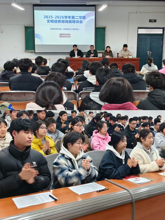 2026年3月12日,学生处组织召开新学期文明督察部岗前业务培训会。本次培训旨在进一步加强学生自主管理队伍建设,提升校园督察工作规范化、专业化水平,帮助新成员尽快转变角色、适应岗位要求。学生处处长李恪、副处长房慧萍出席会议。会议由汤瑶池老师主持。