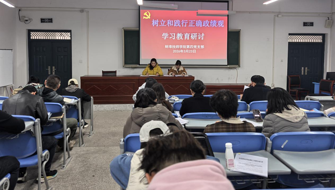 2026年3月23日,蚌埠技师学院第四党支部组织召开了树立和践行正确政绩观学习教育专题研讨会,会议围绕深入学习贯彻习近平总书记关于树立和践行正确政绩观的重要论述开展学习研讨,持之以恒推进全面从严治党,紧扣教育工作核心,推进学院提高管理服务质量,以学习教育实效赋能学院高质量发展。支部组织委员路苗章主持会议,支部全体党员出席会议。