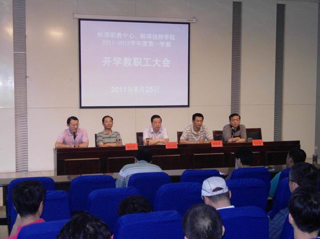 2011年8月25日下午,蚌埠高级技工学校、蚌埠职业教育中心召开实质性整合后的第一次教职工大会,全面部署新学期开学工作。整合工作筹备组成员、原蚌埠职教中心、蚌埠技师学院东校区全体教职工近250人参加了会议,筹备组组长胡业武、副组长陈元高及刘方生、马太民在主席台就坐。会议由马太民同志主持。
