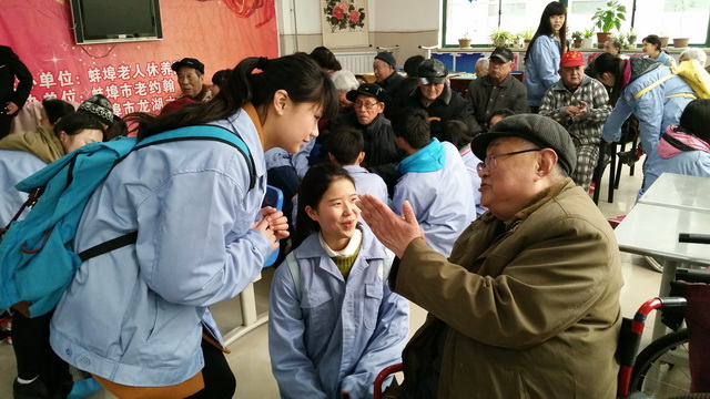 3月19日下午,在团委组织下,自愿报名产生的39名志愿者,徒步抵达老年康复医院,徐院长热情的接待了我们。随后同学们投入到和老人的交流慰问中,为老人们表演歌曲《让我们荡起双桨》、听老人讲故事,分发慰问品,给老人们带去欢乐和温暖。院长对我们的到来表达了诚挚的谢意,并给我们学校颁发了荣誉证书。学生们一边表演节目,一边陪老人聊天,听询他们过去的故事,营造出了一幅温馨的画面。表演结束后,同学们一一把老人送回房间,一位姓系的婆婆,拉着学生的手,依依不舍的说“这两个闺女今天就是我侄女了,要多来看婆婆啊”。