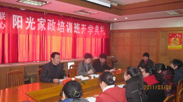 2011年3月8日下午,在全校教职工喜庆“三八”妇女节这一有着特殊意义的时刻,我校与市妇联联合举行了家政服务培训开班典礼。胡业武校长主持会议,并总结了2010年家政服务培训工作。市妇联主席蒋鸿燕、市商务局的领导到会作了讲话。