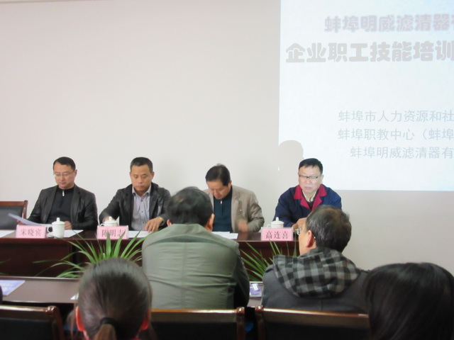 2015年4月14日,我校宋晓宾副校长带领成教处同志赴蚌埠明威滤清器有限公司,召开企业培训开班仪式,正式拉开我校2015年度企业培训大幕。在我校陈校长、宋校长的直接领导下,在蚌埠市人社局大力支持下,我校与企业方强强联手,共同打造高技能人次培养模式。