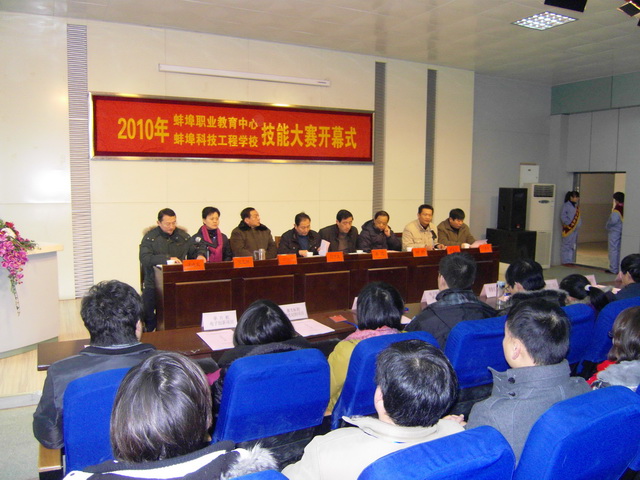 2011年1月8日~9日,蚌埠职教中心(蚌埠科技工程学校)隆重举行了2010年度技能大赛。这次比赛,是蚌埠职教中心以创先争优活动为抓手,落实质量兴校,深化职教改革,培养高素质技能型人才的重要举措,是全校师生教学比武展示才能的盛会,是检验学校教学成果、教育质量和办学水平的重要平台。1月8日上午8:30,举行了盛大的开幕式,市教育局副局长李凯、职称科副科长柯杨应邀出席开幕式。开幕式结束后,300余名学生进入比赛现场,展开了竞技。比赛隆重、热烈、紧张、有序。