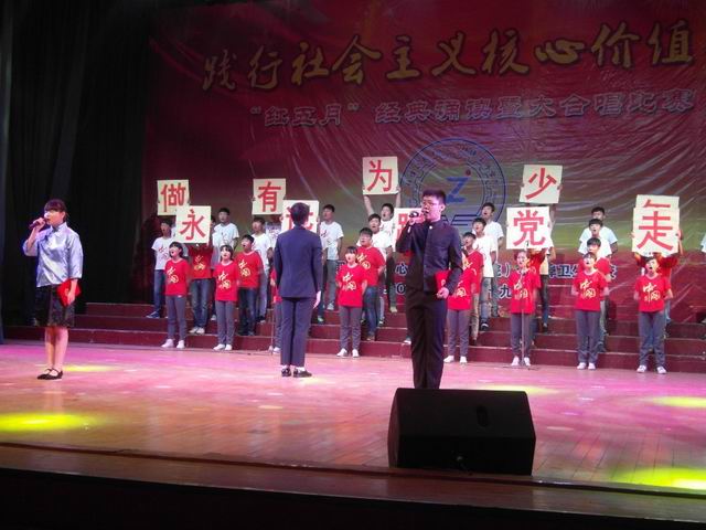 比赛从诗篇《我骄傲,我是中国人》的铿锵诵读中开始,在《十送红军》的深情合唱中结束,13组合唱队一颂一唱,26个节目次第展开,精彩纷呈。比赛中,同学们载歌载舞,精神饱满,感情真挚,浓浓的爱党爱国爱社会主义情感融入每一个节目,现场每个人深受感染。比赛结束后,胡业武书记为获得一、二、三等奖的班级颁奖;张玉琳副校长对本次活动进行了总结,向获奖的班级表示热烈祝贺,向为本次活动成功举办付出辛勤汗水的师生们表示诚挚感谢。