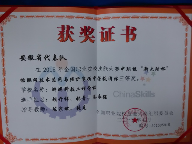 在今天上午结束的2015年全国职业院校技能大赛中职组物联网技术应用与维护项目比赛中,我校计算机专业选手不负众望,获得该赛项国家级三等奖,实现了我校计算机专业在全国大赛中的历史性突破,为安徽职业教育赢得了荣誉,为蚌埠市代表队和学校赢得了荣誉。在此,谨向陈家斌、张克两位指导教师和蔡永强、胡开祥、张青三位参赛选手表示热烈祝贺!