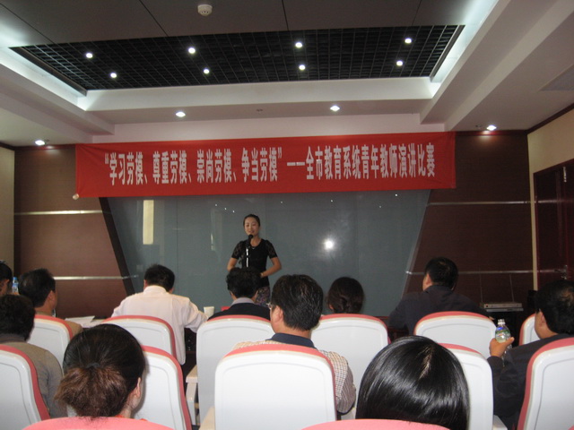 为进一步推进教育系统文明创建活动,在各级各类学校大力弘扬爱岗敬业、争创一流,艰苦奋斗、勇于创新,淡泊名利、甘于奉献的劳模精神,宣传我市教育系统一线教师的先进事迹,在全社会营造学习劳模、尊重劳模、崇尚劳模、争当劳模的良好氛围,市教育工会日前举办了“学习劳模、尊重劳模、崇尚劳模、争当劳模”为主题的全市教育系统青年教师演讲比赛预赛。比赛中,我校青年教师李姗姗音色优美、仪态大方、发挥出色、演讲内容丰富,以优秀的成绩一举闯入决赛。预祝她在十月份的决赛中再获佳绩!