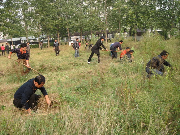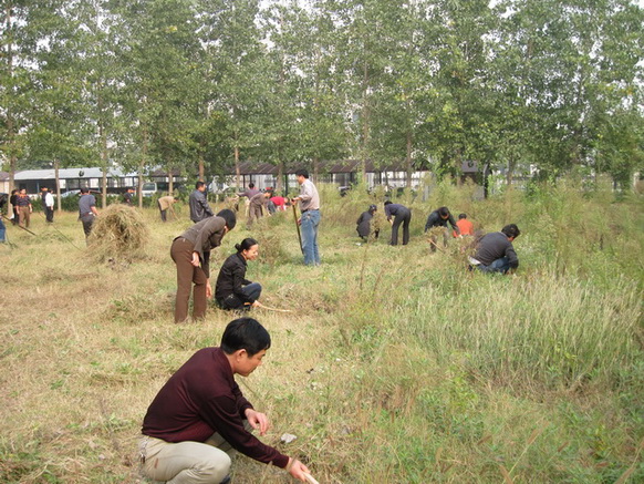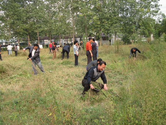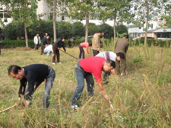 下午上班时间未到,党员们就早早来到排球场,经过一个暑假的疯长,场地周边已是荒草丛生,夹杂的蒿草有的已漫过头顶。总务部门已准备好了镰刀、锄头、钢叉等工具,不等刘方生校长、马太民书记发话,党员们争先恐后地操起工具,砍的砍,锄的锄,耧的耧,一会儿,身后就堆起了草垛,参差不齐的杂草地重新变得平整起来。劳动场面气氛热烈,党员们有说有笑,愉悦的心情驱赶了紧张的劳碌。一个半小时后,大片的蒿草被彻底清除,党员们为蚌埠职教中心文明创建又立了一功。