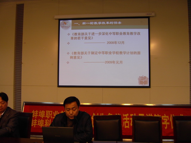 本次研讨会由教研室阚青同志主持。教务科长李方显结合我校实际情况,从五个方面对新一轮教改中的课程改革作了专题辅导报告:一、新一轮教学改革的任务;二、 德育、文化及专业课程的改革;三、贯彻以人为本的办学理念;四、推进行为导向课程模式;五、有效开发教育资源,提高教学质量。李科长的精彩辅导报告博得全场热烈掌声。