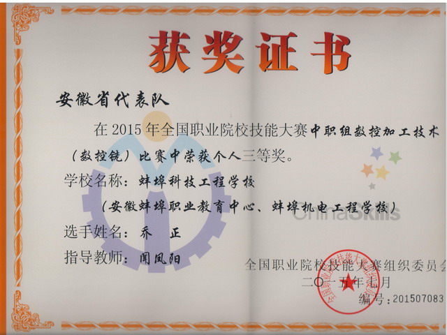 2015年全国职业院校技能大赛现代制造类项目比赛7月1日-4日在天津举行。代表安徽省参加大赛的我校机械工程系学生乔正在中职组数控加工技术(数控铣)项目比赛中克服困难、发扬拼搏精神,夺得国赛三等奖的优异成绩,为蚌埠市和学校再创新荣誉。
