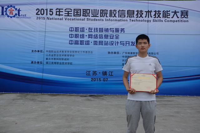 7月18日,在镇江闭幕的2015年全国职业院校信息技术技能大赛中,我校计算机专业学生张良钰在微网站设计与开发赛项中获得三等奖。在此,谨向获奖同学及陈家斌、王颖两位指导教师表示热烈祝贺!