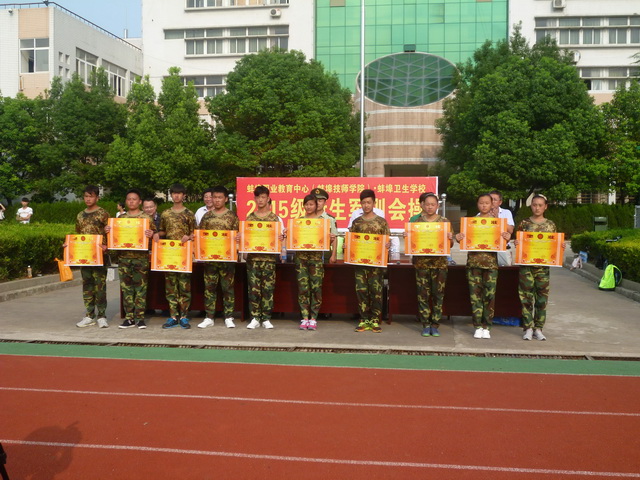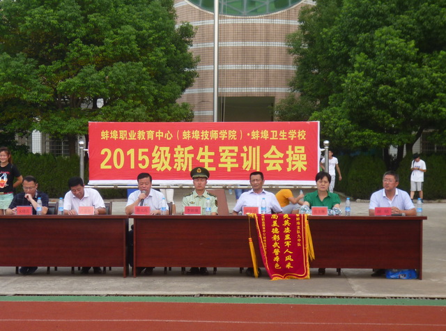 会操结束后,陈校长作了军训工作总结讲话,胡书记向武警支队九中队赠送了锦旗,张玉琳副校长宣读了《关于表彰2015级新生军训标兵的决定》和军训会操成绩,最后举行了隆重的颁奖仪式。