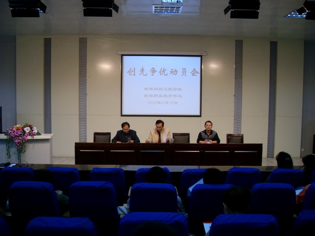 2010年6月10日下午,我校在多功能报告厅召开了深入开展创先争优活动动员大会。全校39名党员参加了动员大会。校长、创先争优活动领导小组副组长刘方生宣读了《蚌埠职教中心创先争优活动实施方案》,对创先争优活动进行了部署。校党总支书记、创先争优活动领导小组组长马太民同志作了动员。副校长、创先争优活动办公室主任宋晓宾主持会议。