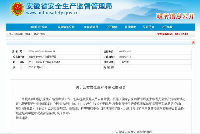 2015年11月16日,我校申报的安徽省安全生产资格考试考点获得安徽省安全生产监督管理局批准。这是我校继今年六月获取安徽省安全生产培训甲类资质后,在该项培训的考试环节获得的又一重大成果,安全生产培训业务将得到新拓展。