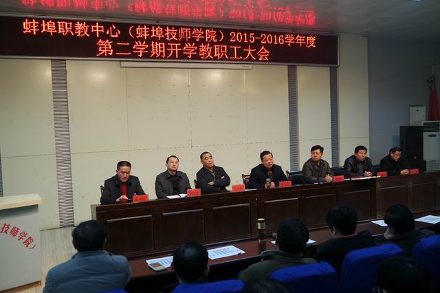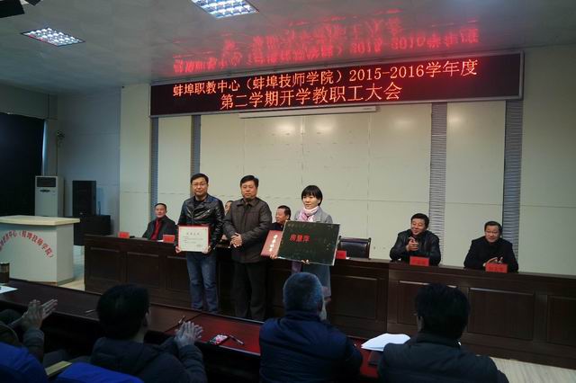 2月26日上午,蚌埠职教中心(蚌埠技师学院)召开全体教职工大会,部署2015-2016学年度第二学期开学工作及学期重点工作,校领导陈元高、郝登峰、马富强、卢嘉砾、宋晓宾、包太平、陈劲松出席会议。陈元高校长主持会议并作工作报告,郝登峰书记向名教师、名班主任授牌。