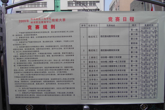 2009年12月26日~27日,蚌埠职教中心(蚌埠科技工程学校)举行了为期两天的学生技能大赛。这次比赛,是蚌埠职教中心贯彻落实科学发展观和建设职教大省的要求,以人为本,深化职业教育改革,培养高素质技能型人才的重要举措,是全校师生教学比武展示才能的盛会,是检验学校职业教育教学改革成果、教育质量和办学水平的重要平台。比赛隆重、热烈、紧张、有序。