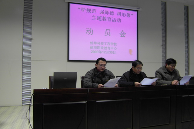 2009年12月30日,蚌埠职教中心召开动员大会, 正式启动 “学规范,强师徳,树形象”师徳主题教育活动。全校教职工参加了大会,宋晓宾副校长主持会议,卢嘉瓅副校长宣读了活动实施方案,刘方生校长作动员报告。