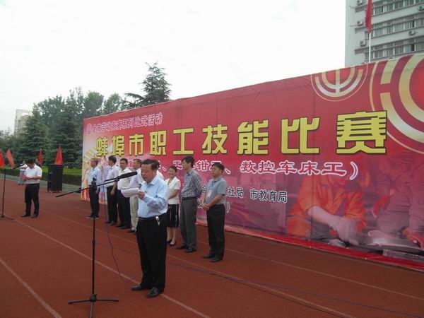 图为陈元高校长在2016年学校承办全市职工技能大赛开幕式上讲话