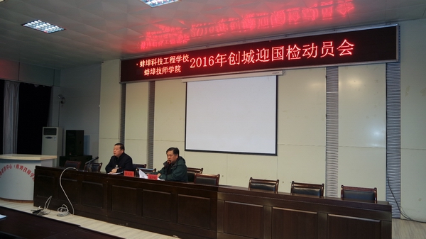郝登峰书记在传达蚌埠市教育局迎国检动员会精神后,提出该校进一步落实创城目标责任制、全面提升创城工作水平的具体要求,提出以积极的态度、有效的行动和明显的成效,迎接2016年的国家检查。